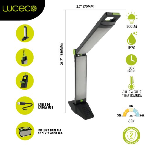 colgarla en prácticamente cualquier lugar. - Intensidad Luminosa: Proporciona una luz de 800 lúmenes con tres configuraciones de iluminación diferentes